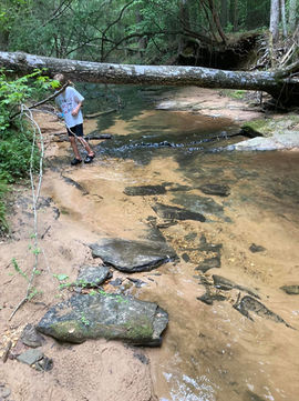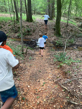 The Buddy Powell Pavilion sits adjacent to woods and a wide, shallow creek. Crawdads and mussels fill the creek, while animal tracks and plenty of roly polies and other insects invite campers to explore the nearby woods. Next to the creek is a playground as well as a large grassy area for enjoying our camp's educational games.